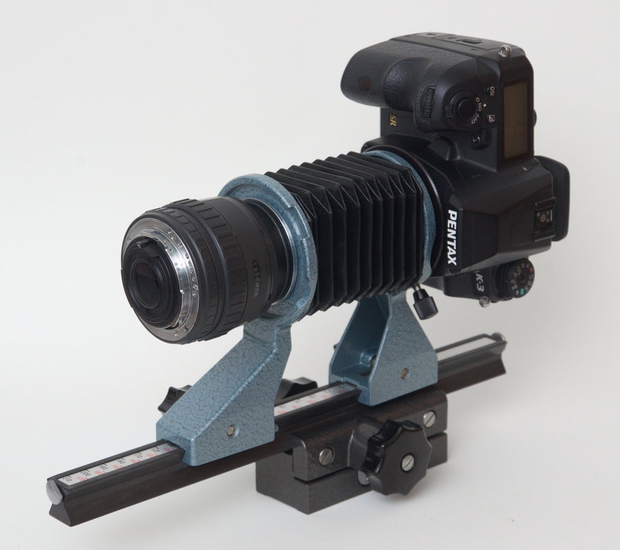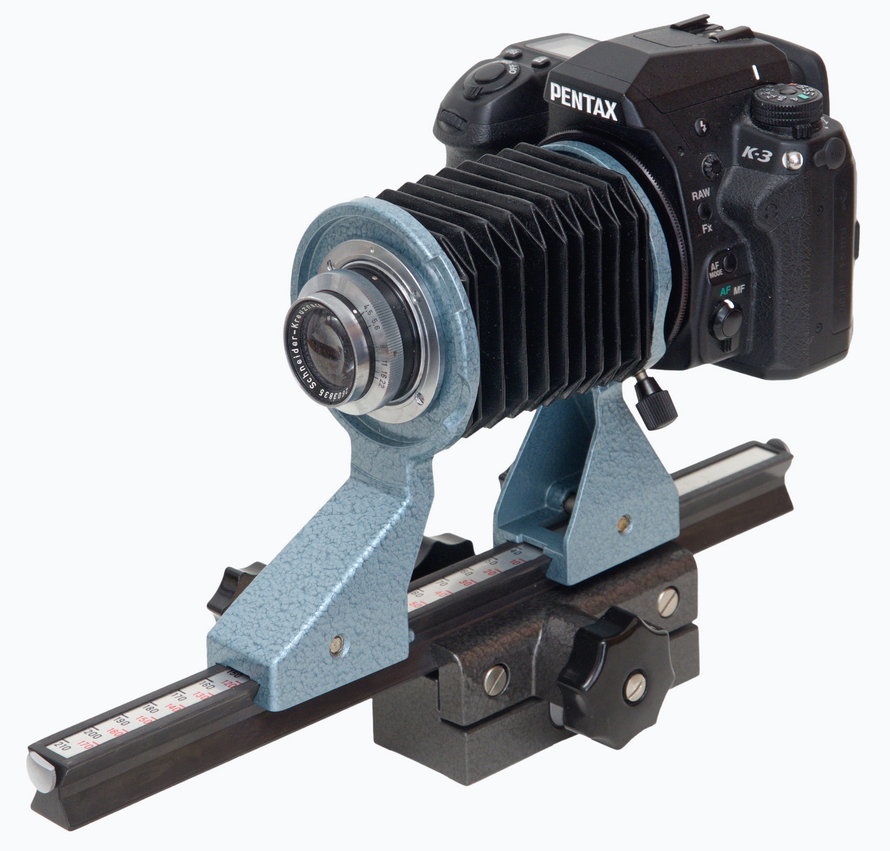 Das Kameragehäuse wird je nach Modell über Bajonett oder M42-Gewinde (ggf. mit Adapter) an der Kamerastandarte befestigt. In beiden Fällen lässt sich die Kamera quer, hoch oder schräg drehen. Das Objektiv wird entsprechend per Bajonett oder Schraubgewinde montiert. Praktisch jede Brennweite zwischen etwa 35 und 135 mm eignet sich dafür. Kürzere Brennweiten sind nur bei extremer Vergrößerung oder für spiegellose Systemkameras mit kürzerem Auflagemaß sinnvoll, längere Brennweiten eher bei weniger extremem Nahbereich oder für ferne Motive.
