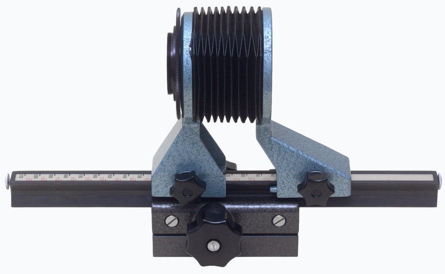 Das Gerät besteht aus einer relativ langen Führungsschiene, die auf einer Basis mit Stativanschluss (1/4" und 3/8") sitzt. Diese Basis enthält eine Triebfunktion, die die Schiene als präzisen Einstellschlitten (Focus-Rail) bewegt. Der Balgenaufsatz umfasst die Objektiv- und Kamerastandarte, die durch den faltbaren Balgen verbunden sind und Profile haben, die exakt auf die Schiene passen. Der Aufsatz wird auf die Schiene geschoben. Die verschiebbaren Standarten lassen sich jeweils mit Klemmschrauben fixieren. Die Auszugsverlängerung beträgt 35 bis 210 mm. Die genaue Länge liest man an der senkrechten Rückfläche des Kameraträgers an einer Skala ab mit schwarzer Zahlenreihe für normale Objektive und roter für das spezielle Jena T 2,8/50 mm in versenkter Fassung.