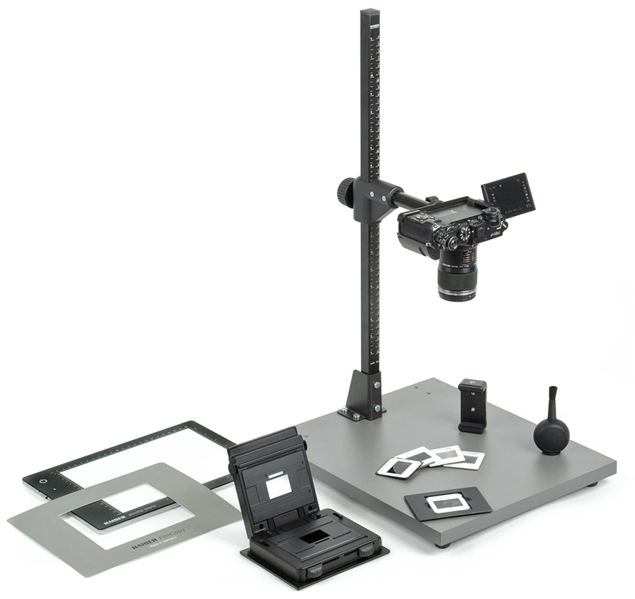 Lieferumfang: Reprostativ reprokid und FilmCopy Vario Kit mit Haltevorrichtung FilmCopy Vario, inkl. Formateinlage für Kleinbild-Dias, Formatmaske 24 x 36 mm und Auflagematte für die Leuchtplatte slimlite plano nebst Smartphone-Halter und Staubpinsel.UVP (2025) für das Reprostativ mit dem FilmCopy Vario Kit: 549 €