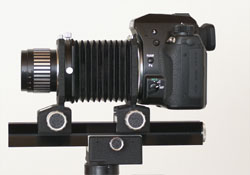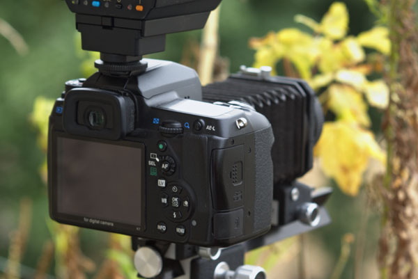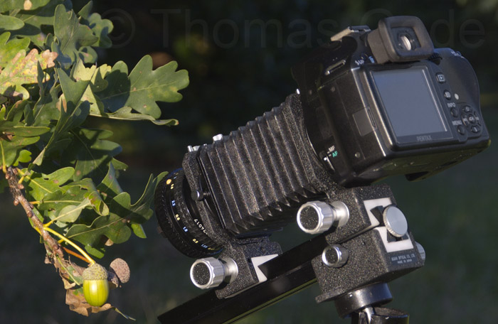 Kamera mit Blitz (indirekt blitzen!!), Balgen und Objektiv in der Makrofotografie