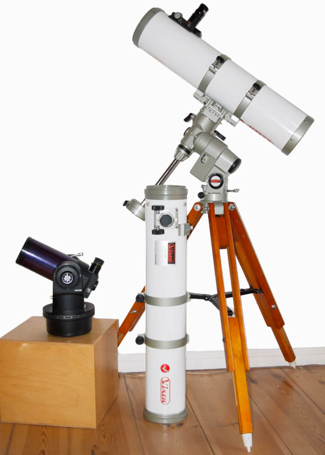 Zudem gehört zu dem Teleskop ein kleines Sucherfernrohr, welches störend nahe am Okular befestigt ist. Man kann darauf verzichten und sich mit einem 30 bis 40 mm Okular zum Suchen der Objekte behelfen. Alternativ könnte man vorne auf dem Tubus die Basis für einen Leuchtpunktsucher befestigen. Ein Telrad wäre zu groß.