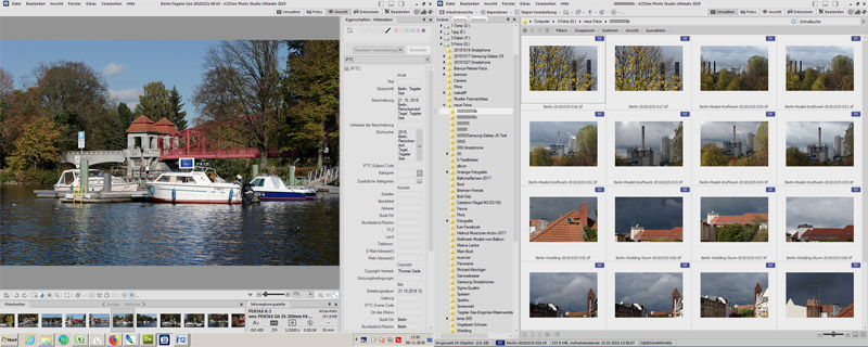 ACDSee Photo Studio Ultimate 19 auf zwei Monitoren. Links: Einzelbild mit Metadaten. Rechts: Verzeichnisse und Thumbnails