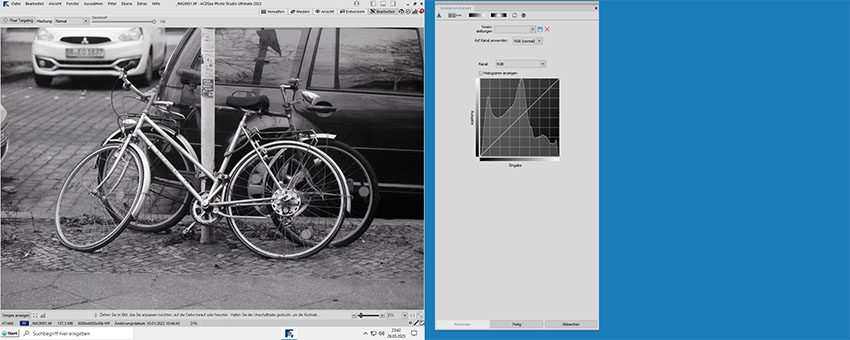 ACDSee Photo Studio Ultimate 2023 auf zwei 21-Zoll Monitoren. Die zuvor in der linken Seitenleiste fixierte Gradationskurve schwebt auf dem zweiten Bildschirm.