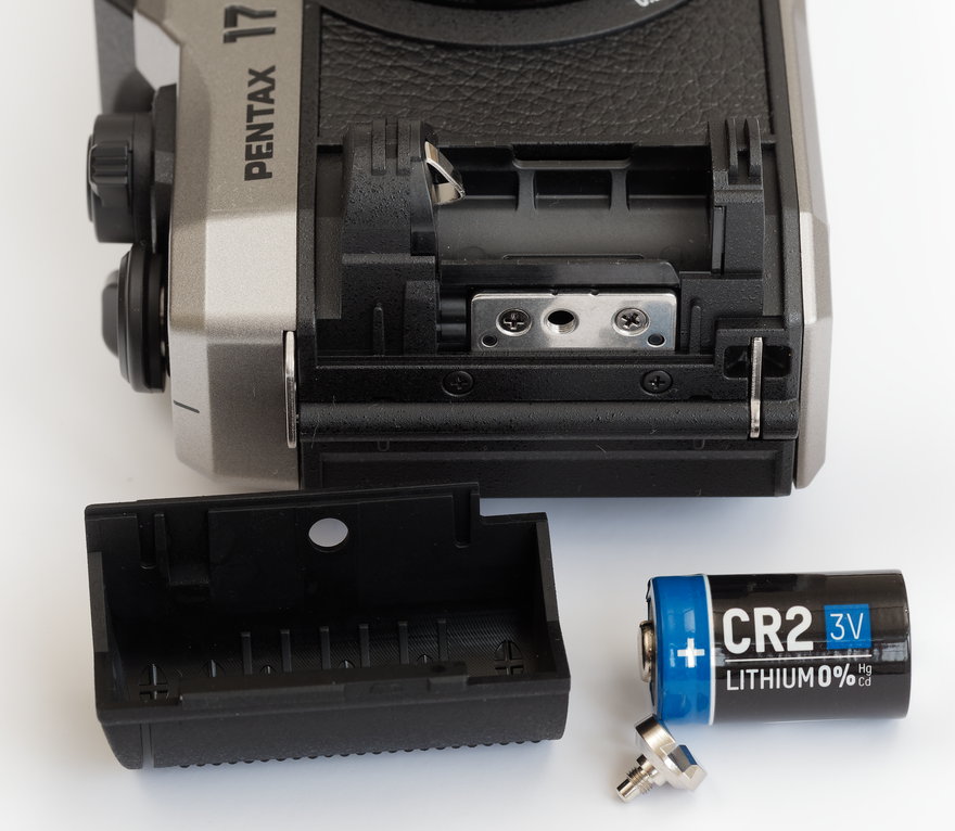 Die Rückwand der Pentax 17 ist aus Kunststoff gemacht. Aber der Haken für die Verriegelung besteht aus Metall. Das ist sehr gut, weil Haken aus Plastik leicht abbrechen.