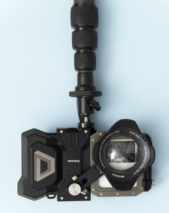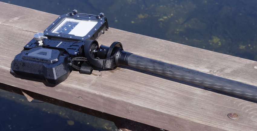 Eine lange ausziehbare Teleskopestange zum Eintauchen der Kamera vereinfacht Unterwasseraufnahmen.