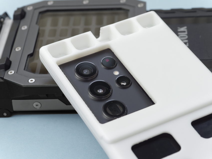Samsung Galaxy S 22 Ultra im maßgeschneiderten Adapter für das Unterwassergehäuse Divevolk Seatouch 4 Max. Der Hersteller hatte ihn mir auf Anfrage mit einem 3-D Drucker hergestellt und von China nach Deutschland geschickt.