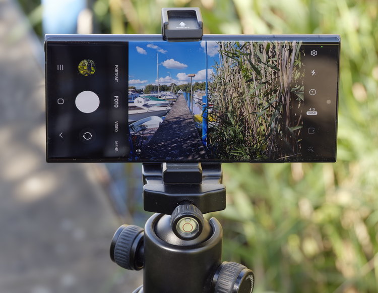 Samsung Galaxy S22 Ultra im Fotomodus auf einem Stativ