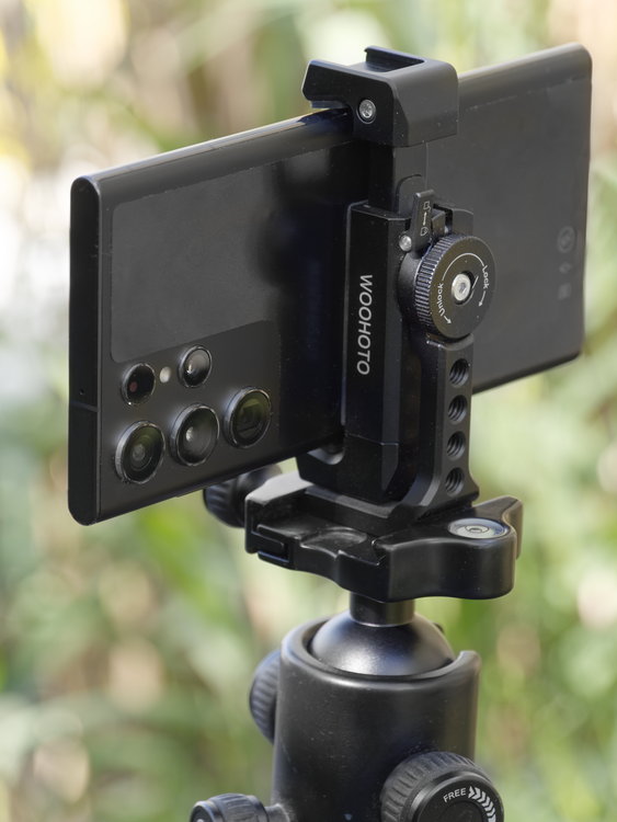 Samsung Galaxy S22 Ultra in der Zubehör- und Stativklemme von Woohoto auf einem Stativ
