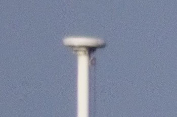 Anschließend konnte das Tasco V8 mit dem 6mm Okular noch gut scharf gestellt werden. Das entsprach einer Vergrößerung von 166x. Bei einem Test mit einem 7,5mm Baader Eudiaskop und einer guten 2x Barlow (266x) ließ sich das Bild immer noch scharf stellen, aber das Bild wurde durch die kleine Austrittspupille recht düster. Die Details der Mastspitze auf dem Foto waren visuell viel deutlicher zu erkennen.